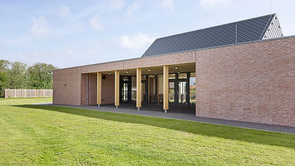 Gebaut wurde mit viel Holz. Für die Fassade wurde auf einen klassischen, hellroten Ziegel zurückgegriffen, der in Ziegelfarbe verfugt wurde. Das geneigte Dach und dessen Giebelwände wurde mit anthrazitfarbenen Aluminiumschindeln gedeckt.
