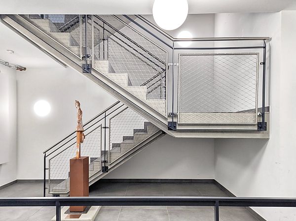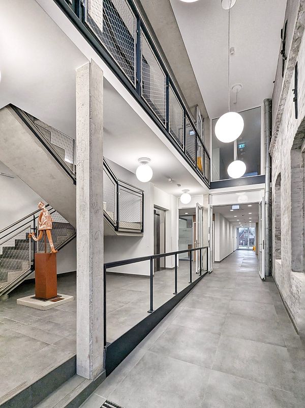 Eine gläserne Fuge dient als Haupteingang und denkmalgerechte Trennung zwischen Alt und Neu. Es entstand eine Allgemeinarzt- und eine Kinderarztpraxis, eine Apotheke sowie ein Sanitätshaus und ein Pflegestützpunkt.