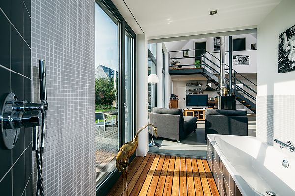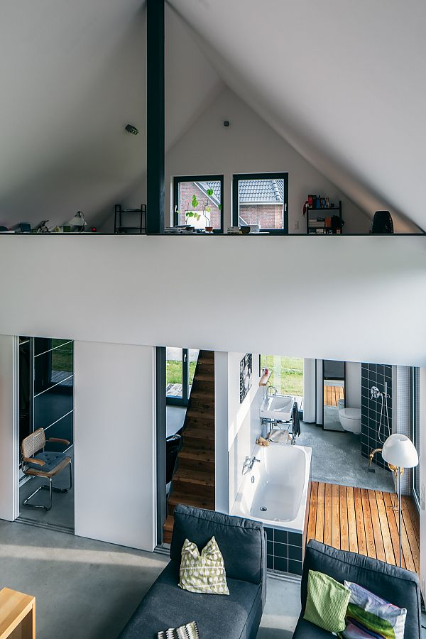 Selbst das Badezimmer lagert sich offen an. Die wenigen Möbel stehen auf Rollen und lassen sich schnell neu arrangieren. Eine bewusst so gewählte einfache Aussage wie bei einem kleinen landwirtschaftlichen Zweckbau unterscheidet sich extrem von der Vielfalt anderer Neubauten auf dem Dorf. Mit einem Blick ist alles erfassbar.