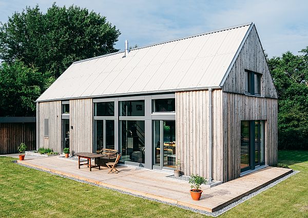 Die Besonderheit dieses äußerlich kleinen, innen aber bemerkenswert großen, dazu außerordentlich energieeffizienten Hauses ist seine Offenheit. Durch sehr große Fenster an den Längsseiten kann man von der Straße, die eher ein Weg in die Weite der Wiesen ist, bis auf die Koppel dahinter hindurchsehen. Die Mitte nimmt ein einziger Raum ein, vom Fußboden aus nacktem Estrich, auf den garantiert nicht irgendwann noch ein Teppichboden gelegt werden wird, bis hinauf zum First. Küche, Wohnraum, Essplatz, Kaminecke – alles befindet sich unter dem Dach dieser hohen Halle.