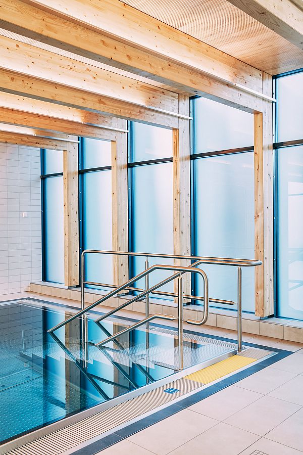 Für Betreuer und z.B. Angehörige oder Besucher sind außerdem normale Umkleidekabinen und Duschen vorgesehen. Man betritt das Gebäude über einen Windfang, durch den man entweder direkt das Schwimmbad betritt oder über einen breiten Flur zu den Umkleideräumen gelangt.