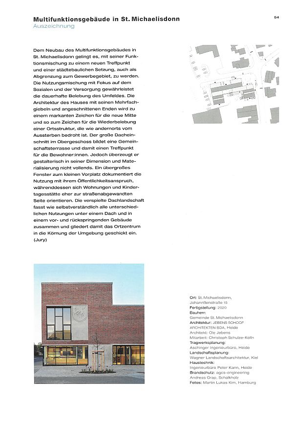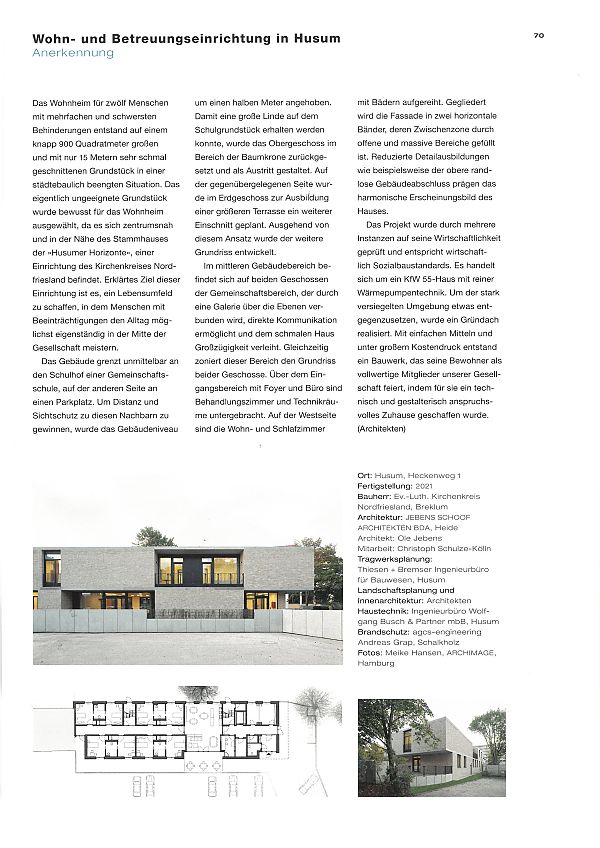 Wir haben mit unserem "Donner Hus" in St. Michaelisdonn eine Auszeichnung und mit dem Bau des Behindertenwohnheims in Husum eine Anerkennung beim BDA-Preis 2023 des Bundes Deutscher Architekten in Schleswig Holstein gewonnen. Wir sind wahnsinnig stolz auf gleich zwei Auszeichnungen, die nur alle vier Jahre für herausragende Bauwerke in unserem schönen Land vergeben werden.