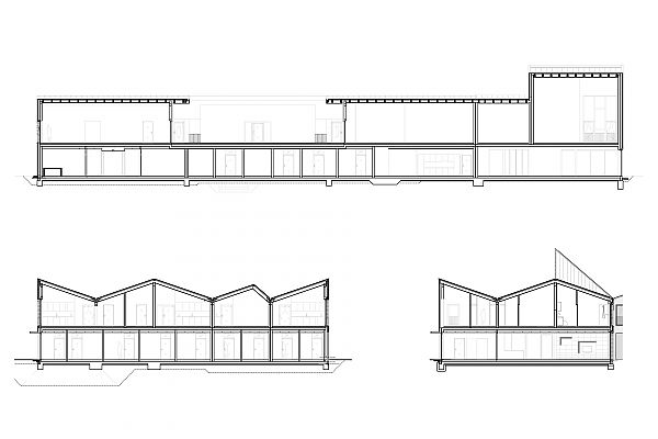 Das Gebäude besetzt einen Großteil des Baugrundstücks, lässt aber gezielt Freiräume und Vor- und Rücksprünge, um sich der umgebenden Bebauung anzupassen. Das Baufeld wurde in ein Raster von 4 x 5 Feldern unterteilt. Durch Subtraktion von 7 dieser Felder entstanden ein kleiner Dorfplatz, ein Einschnitt zur optischen Verringerung der Gebäudelänge und ein gemeinsamer Innenhof. Durch dieses Vorgehen war auch die Unterteilung des Gebäudes in die vielfältigen Nutzungen technisch einfach und im Ergebnis für jeden von außen ersichtlich.