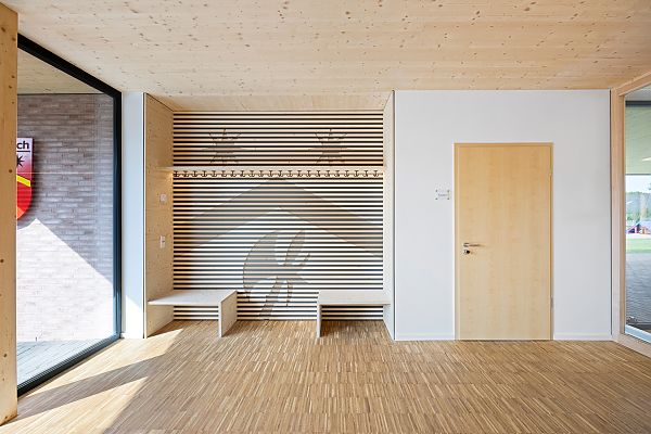 Gebaut wurde mit viel Holz. Für die Fassade wurde auf einen klassischen, hellroten Ziegel zurückgegriffen, der in Ziegelfarbe verfugt wurde. Das geneigte Dach und dessen Giebelwände wurde mit anthrazitfarbenen Aluminiumschindeln gedeckt.