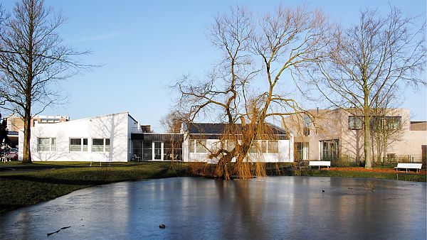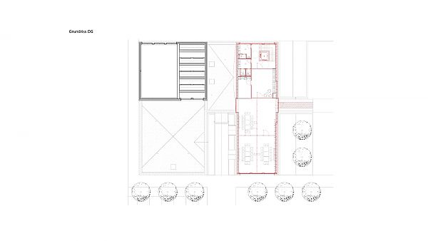 Der Veranstaltungsraum bietet 99 Personen Platz und öffnet sich Richtung Markplatz, während die Nebenräume zum öffentlichen Teich positioniert sind. Die Fassaden sind vertikal gegliedert und lockern die liegende Masse der Aufstockung auf. Durch den Hochpunkt des Veranstaltungsraumes und der bewusst gesetzten Fassadenöffnungen, wird eine Leichtigkeit erzeugt, die anspruchsvoll detailliert ist.