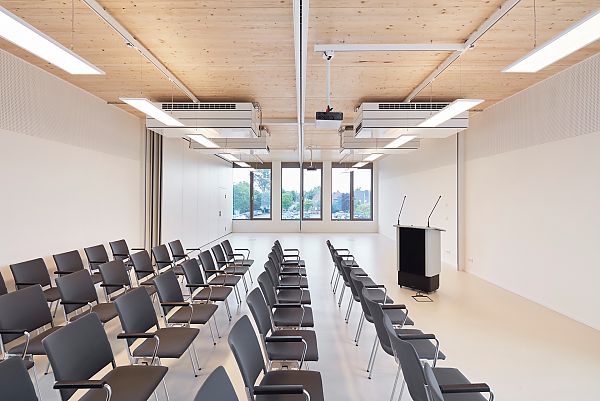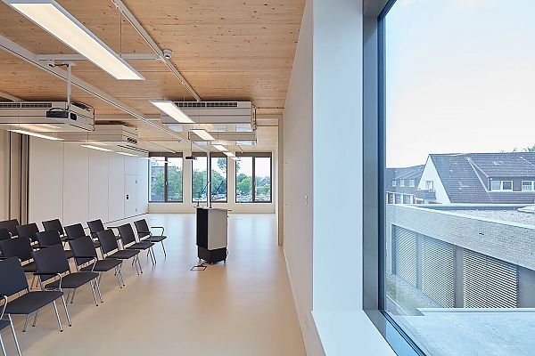 Als Fortführung des bereits bestehenden Angebots beim Gesundheitszentrum Büsum, ist der Neubau des Veranstaltungszentrums in Form einer Aufstockung als logische Konsequenz zu interpretieren. Die Aufstockung ist in Holzrahmenbau mit einer sichtbaren BSH-Decke ausgeführt und konnte aufgrund der geringen Trockenzeit der Materialien in sehr kurzer Zeit realisiert werden.