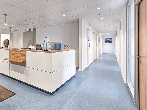 Eine gläserne Fuge dient als Haupteingang und denkmalgerechte Trennung zwischen Alt und Neu. Es entstand eine Allgemeinarzt- und eine Kinderarztpraxis, eine Apotheke sowie ein Sanitätshaus und ein Pflegestützpunkt.