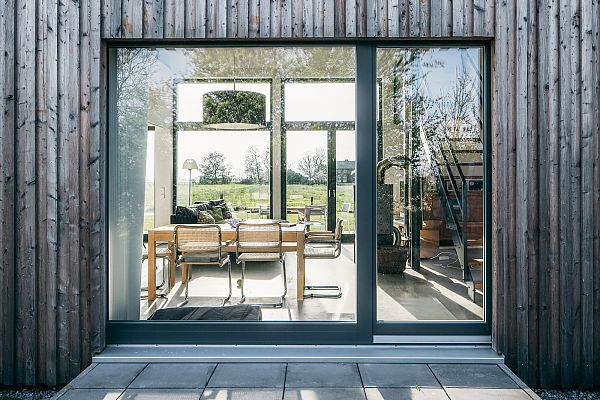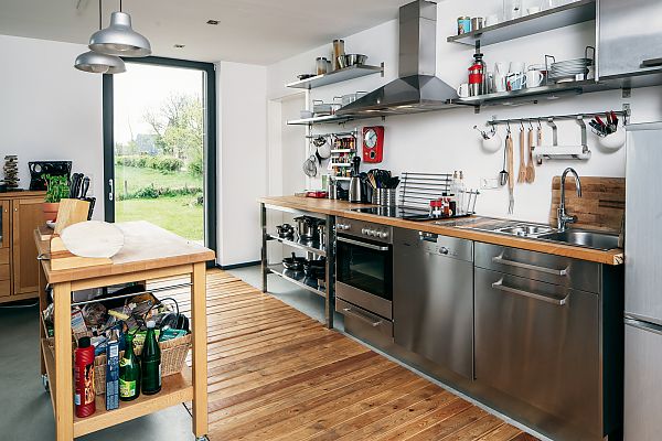 Die Besonderheit dieses äußerlich kleinen, innen aber bemerkenswert großen, dazu außerordentlich energieeffizienten Hauses ist seine Offenheit. Durch sehr große Fenster an den Längsseiten kann man von der Straße, die eher ein Weg in die Weite der Wiesen ist, bis auf die Koppel dahinter hindurchsehen. Die Mitte nimmt ein einziger Raum ein, vom Fußboden aus nacktem Estrich, auf den garantiert nicht irgendwann noch ein Teppichboden gelegt werden wird, bis hinauf zum First. Küche, Wohnraum, Essplatz, Kaminecke – alles befindet sich unter dem Dach dieser hohen Halle.