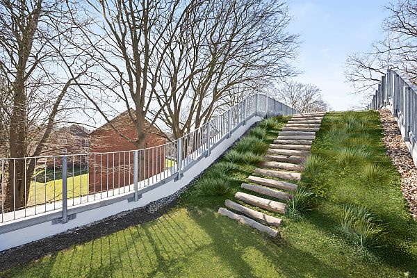 Die augenfälligste Besonderheit des Baus ist die begehbare Dachlandschaft und der direkte Bezug zu der umgebenden Natur inmitten der Stadt Flensburg und in einem sozial eher benachteiligten Viertel. Dieser Wunsch nach einer Nutzung des Dachs kam schon in einer der ersten Planungsbesprechungen vom Bauherrn. So viel Mut wird meistens belohnt, und das Ergebnis spricht für sich: es ist viel mehr ist als ein Gebäude mit Klassenräumen entstanden: eine in allen Ebenen begeh- und erlebbare Spiel- und Lernlandschaft.