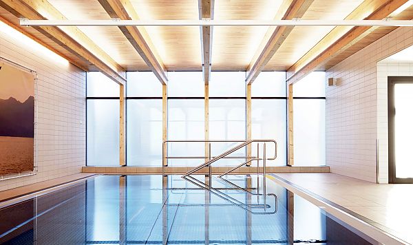 Im Bereich der Schwimmhalle wird das Fassadenmaterial teilweise transparent ausgeführt, schützt die Nutzer jedoch durch die Stege in den Platten vor Blicken.