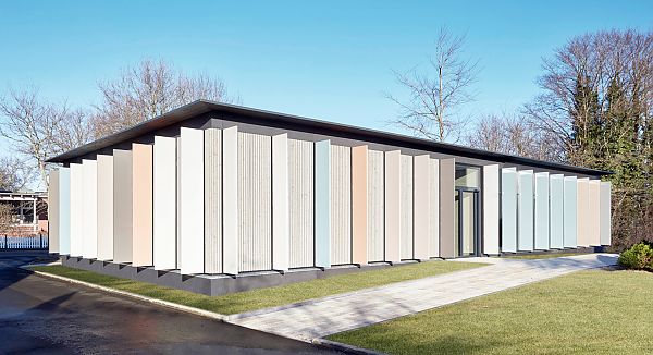 Das Therapie- und Bewegungsbad zeigt schon aufgrund seiner äußeren Anmutung, dass es sich nicht um ein „normales" Freizeitbad handelt. Die Lamellen an den Fassaden sind Sonnen- und Sichtschutz zugleich. Aufgrund unterschiedlicher Farbgebung verändert das Gebäude sein Gesicht aus jeder Blickrichtung und bei unterschiedlichen Sonnenständen.