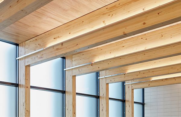 Das Gebäude ist als Mischung aus Holzrahmenbau und Holzskelettbau konzipiert, der seine Konstruktion auch nach außen zeigt. Im Bereich des Schwimmbeckens, wo große Spannweiten überbrückt werden müssen, werden sichtbare Träger aus Buchenfurnierschichtholz (Baubuche) im Raster 1,25m auf die tragenden Ständer der Außenwände aufgelegt. Im Bereich des kleinteiligeren Umkleidebereichs und der Technikzentrale, wo sich tragende Innenwände befinden, werden die Deckenbalken in der Dämmebene nicht sichtbar eingebaut.