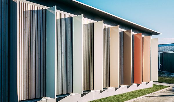 Die Gefache der Außenwand werden als hinterlüftete Fassade durch Stegplatten aus transluzentem Polycarbonat verkleidet. Diese übersetzen die japanische „Fusama"- Schiebewände in moderne Material- und Architektursprache. Im Bereich der Umkleiden und des Technikraums werden die Bereiche bis zum oberen, 60cm breiten Lichtband, der als Belichtung der Nebenräume dient, in einer vertikalen Holzverschalung aus unbehandeltem Lärchenholz ausgeführt.